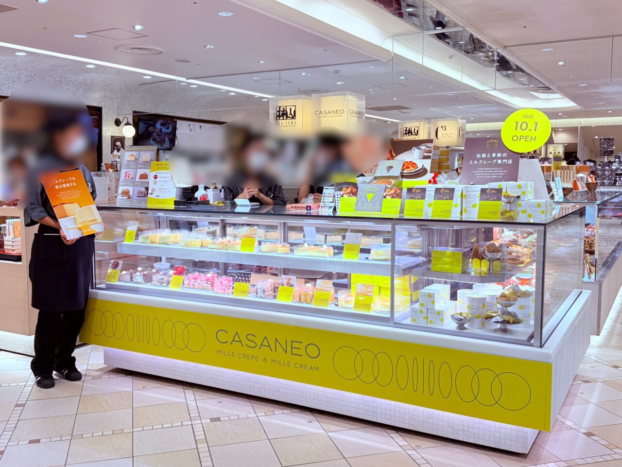 オープンした「CASANEO(カサネオ)」は、ミルクレープが看板商品のスイーツショップで、常設店舗は「大阪梅田店」に次いで2店舗目となります! スイーツショップ「C3(シーキューブ)」の一部にて、同じ会社の別ブランド「CASANEO」として10月1日にオープンしました。