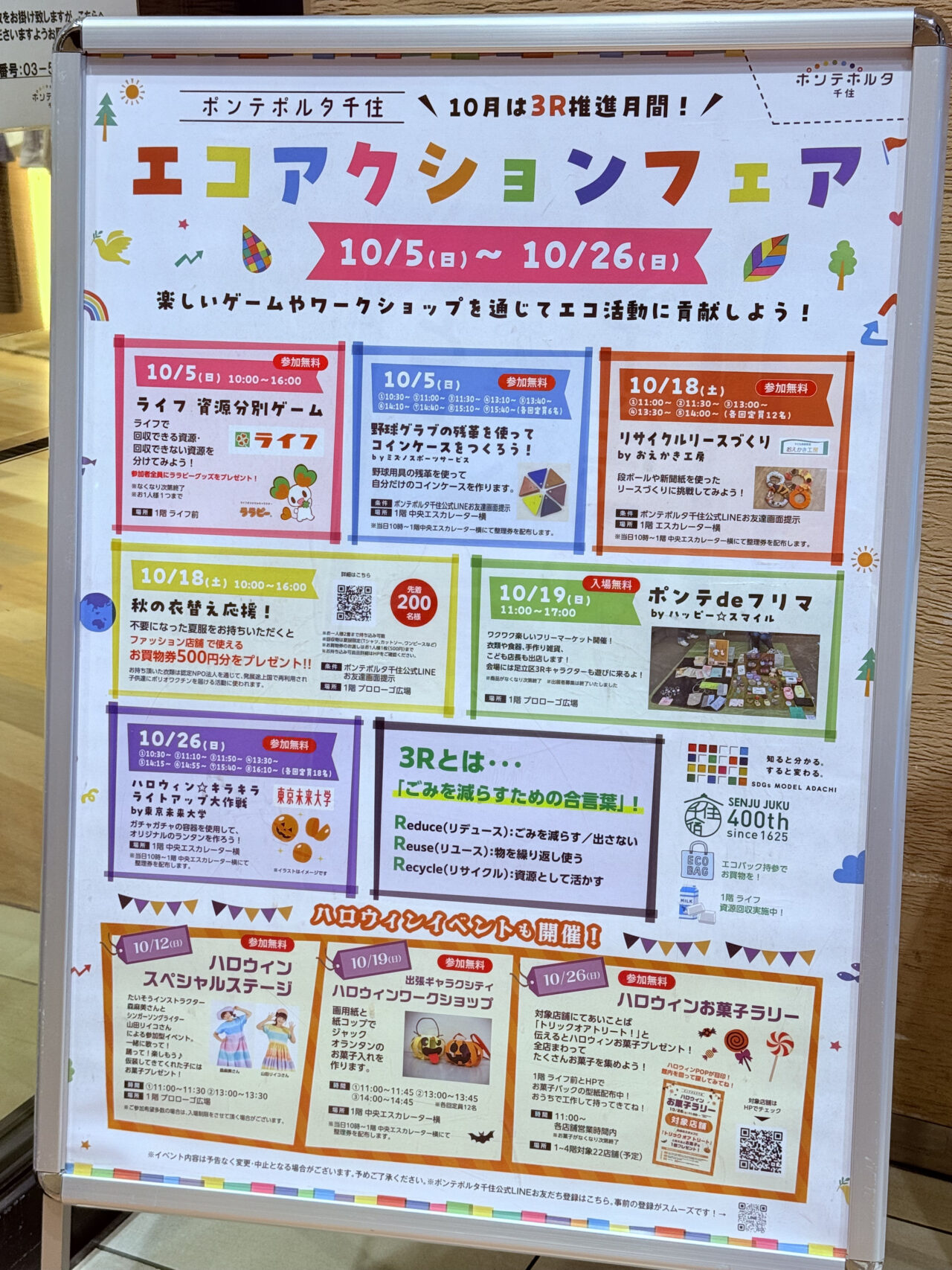京成線「千住大橋」駅すぐ近くの商業施設「ポンテポルタ千住」では、「3R推進月間」に合わせて「エコアクションフェア」を開催中です。イベントを通して、少しでも環境について考えてみるのもよいのではないでしょうか。「ハロウィンイベント」も同時開催される予定ですので、ぜひチェックしてみてくださいね。