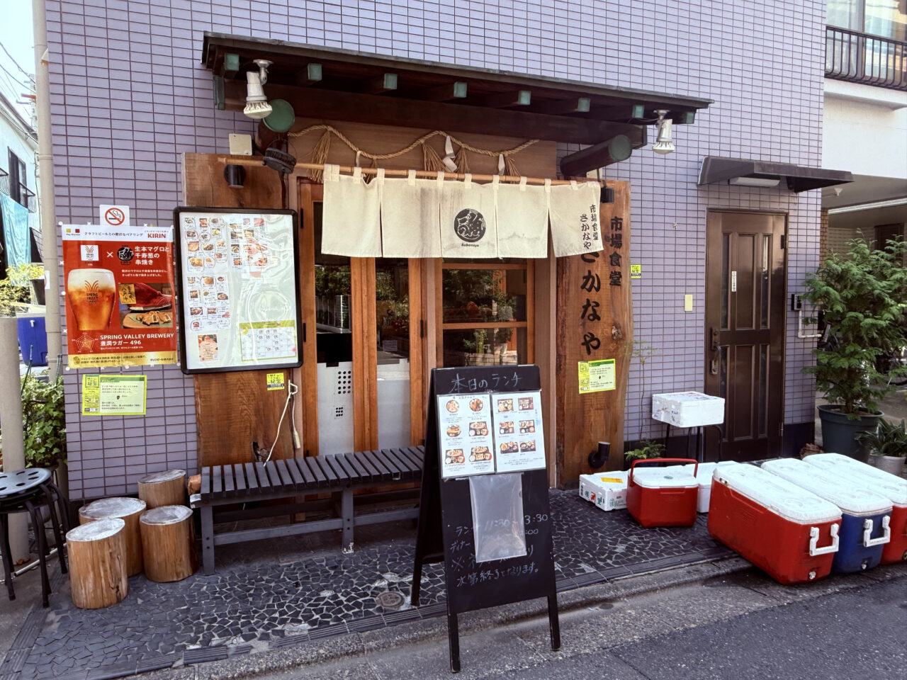 北千住駅から徒歩10分ほどの住宅街の中にある「市場食堂さかなや」。ランチタイムには店前に行列ができることも多く、軒先には待機用のベンチが用意されています。今回は、平日ランチタイムのピークを外して13:30頃に訪問。ちょうど帰るお客さんがいたので、すぐに入店できました。