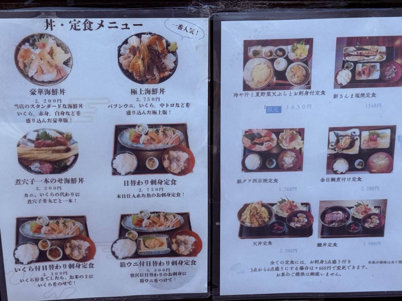外の看板にあったメニューをチェック。海鮮丼は具材違いで3種類、定食は定番の日替わり刺身定食から、旬のさんま使った定食など、9種類ありました。定食には全てお刺身3点盛りが付くという、海鮮好きにとっては嬉しいラインナップです。