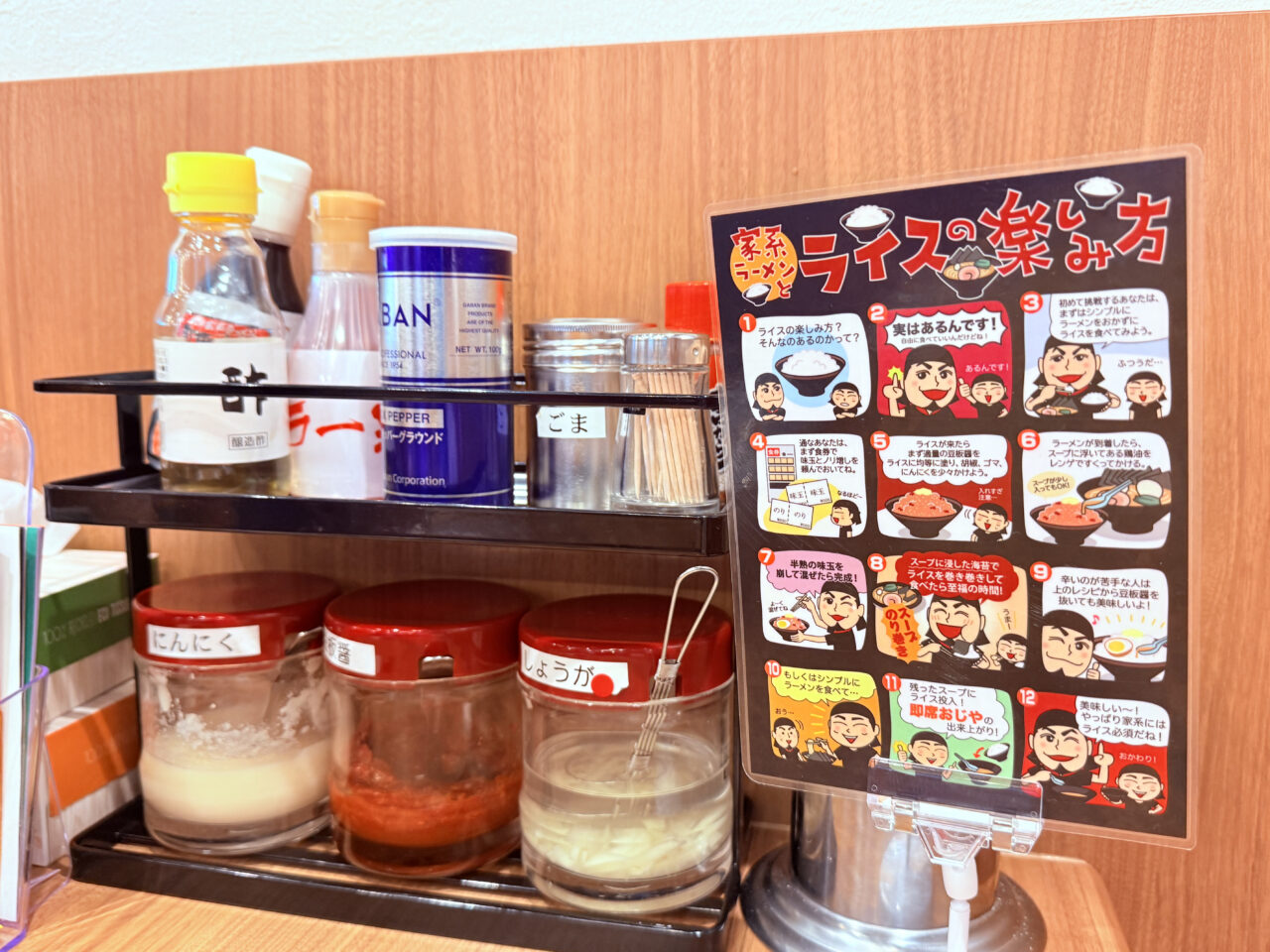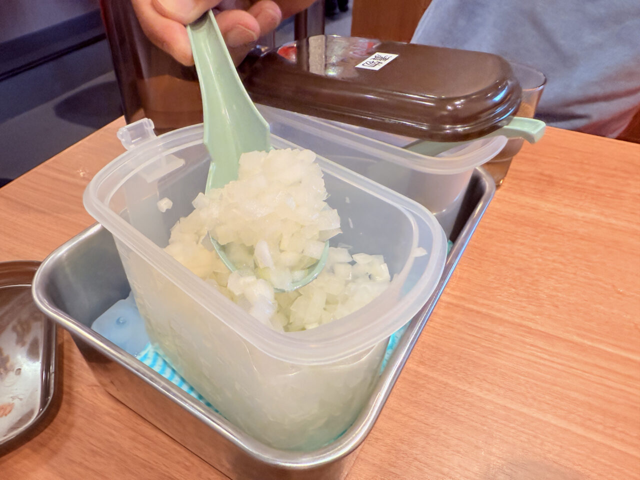 テーブルの上には豊富な調味料、そして生タマネギもあるので、味変も楽しめます。おなかに余裕のある方はぜひライスも一緒に注文して、即席おじやを楽しんでみてはいかがでしょうか。