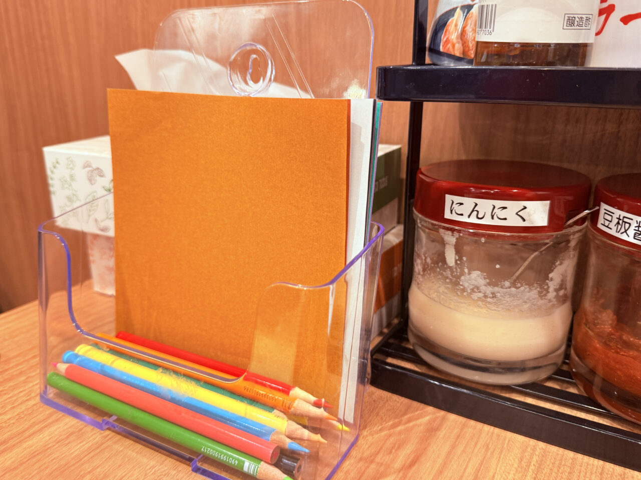 子供と一緒に訪問したのですが、テーブルには子供用の折り紙と色鉛筆が置いてありました。このようなサービス、子連れにとっては嬉しい限りです。