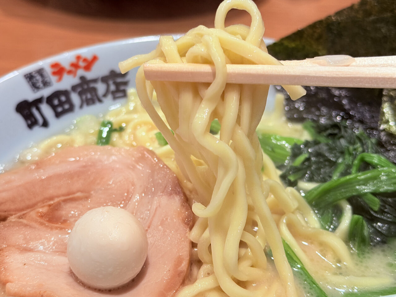 スープをひとくち啜ると、豚骨の旨みが口の中で爆発! 一気に広がります。家系ラーメンといえば、中太のストレート麺。濃厚スープに絡ませながら一気に啜りました。