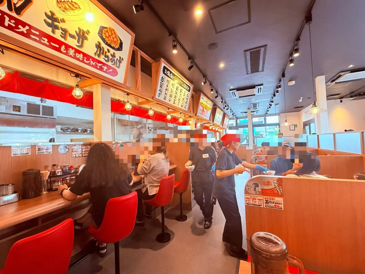 40分ほど待った後、「お待たせしました〜」と番号が呼ばれたので、案内された席へ着席しました。案内されたのはボックス席。店内は厨房に沿ってカウンター席がズラリと並んでいますが、ボックス席は4席しかないので、時間がかかるのも頷けます。