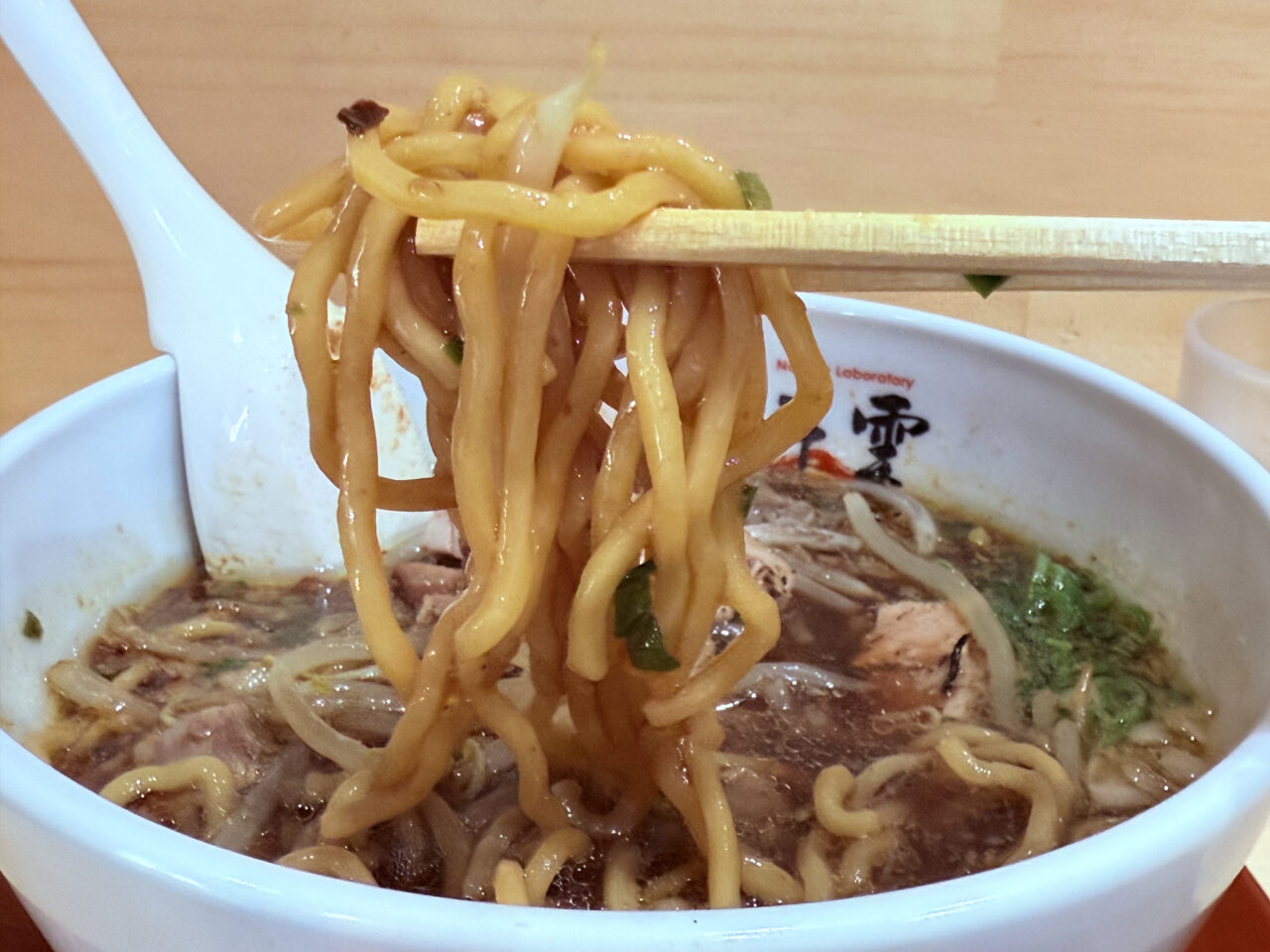 豚骨と鶏ガラの旨味にコク深い醤油がよく合うスープで、見た目からの想像とは裏腹に後味すっきりのスープです。全体を混ぜていただくと、もっちりとした自家製麺にスープの旨味が絡んでとってもおいしく、箸が止まりません! 計算され尽くしたかのようなバランスの良さでした。