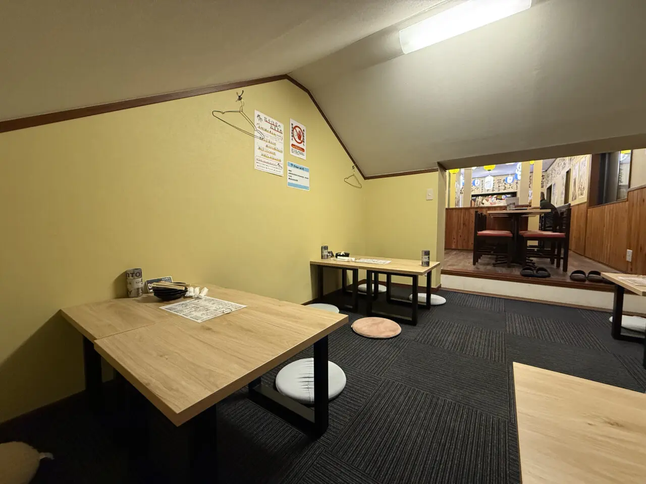 2階の奥にあるお座敷席は、屋根裏の隠れ家のようです。このお座敷席、小さな子が膝をついて座ったり、ゴロンと横になることもできる、子連れにとってはとってもありがたい席なんです。