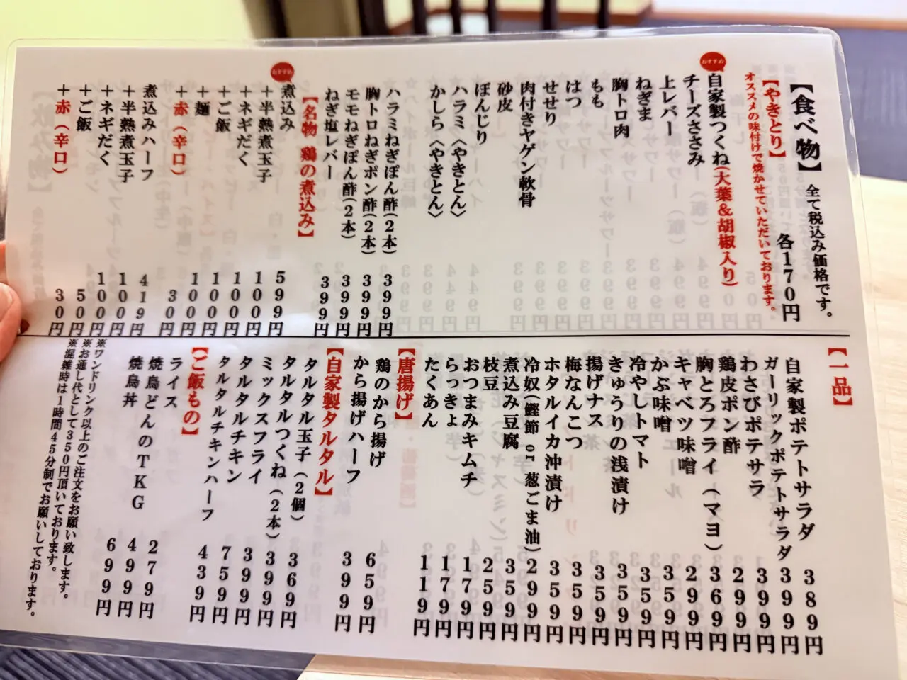 食べ物は、焼鳥を中心に、煮込みや一品料理など、飲兵衛も子供も楽しめそうなメニューが揃っています。メニュー表にはありませんが、単品で焼き海苔もあり、ライスを注文して海苔巻きにしたら子供が喜んで食べていました。