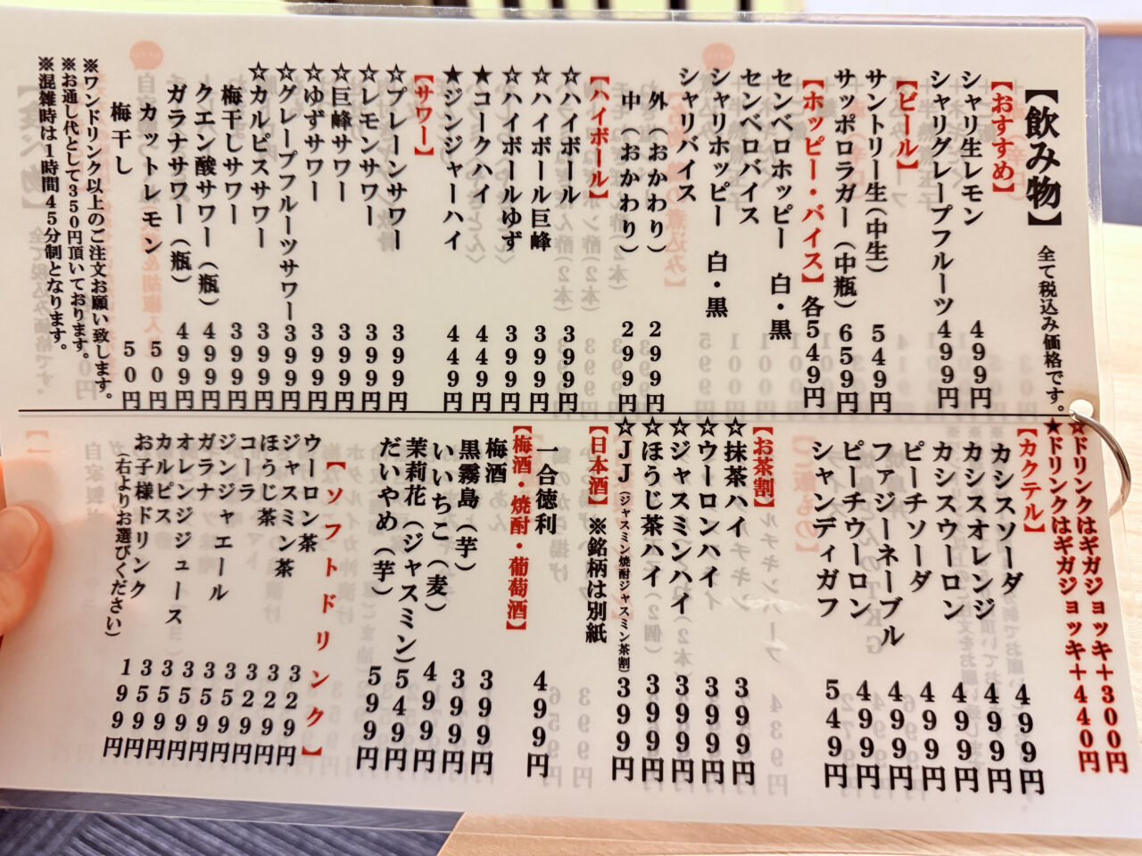 飲み物も充実しており、キンキンに冷たいシャリ系やお得なホッピー、ハイボールといった酒場の定番から、お得199円のお子様ドリンクまで、こちらも存分に楽しめそうなラインナップです。