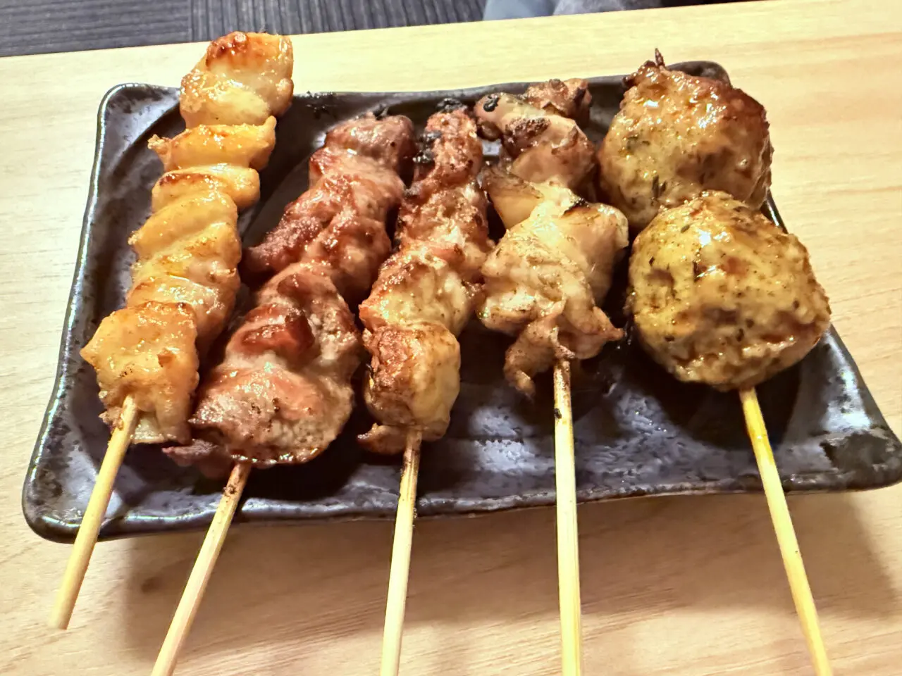 焼鳥はおすすめの5本盛りにしました。どの串もそれぞれの部位に合わせた焼き加減、味付けが抜群でとてもおいしくいただきました。特につくねは、胡椒がきいてピリ辛! お酒が進みます。